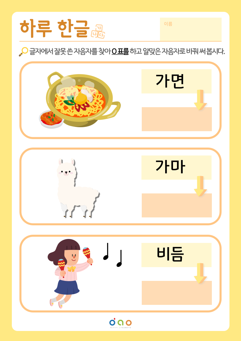 알맞은 자음자로 바꿔 보는 하루 한글 학습지를 함께 해 보아요!