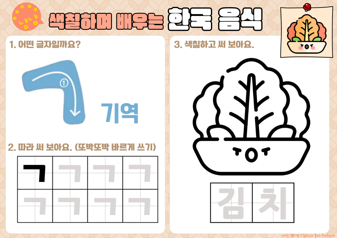 재미있게 색칠하며 한글 공부도 하고, 맛있는 한국 음식도 배워보아요!