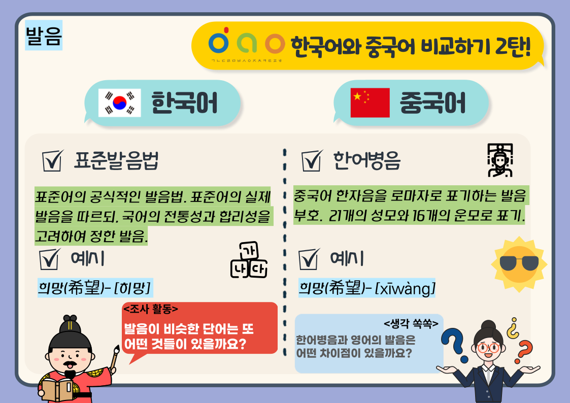하지만 발음을 표기하는 부분에서는 차이점이 있는데요~ 한국어와 중국어의 발음 표기법의 특징을 배워봅시다!