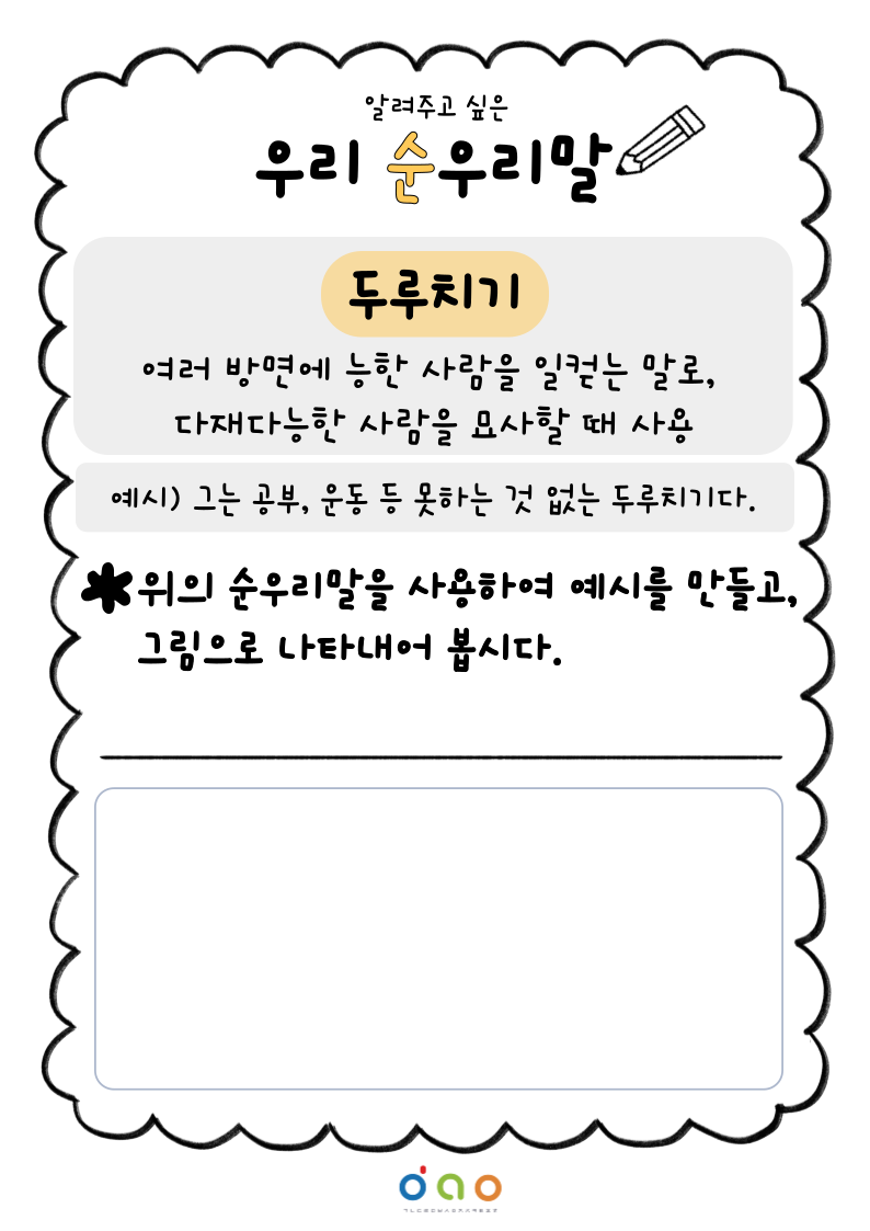 순우리말의 뜻을 알아보고, 배운 말을 사용하여 예시를 만든 후 그림으로 나타내어 봅시다!