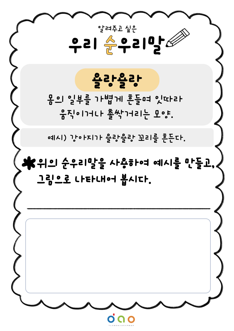순우리말의 뜻을 알아보고, 배운 말을 사용하여 예시를 만든 후 그림으로 나타내어 봅시다!
