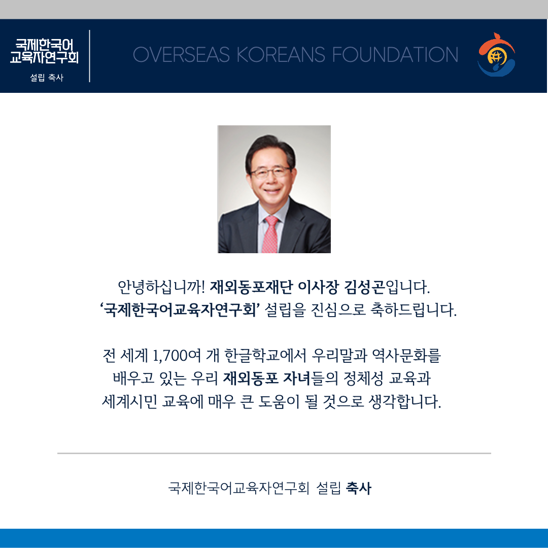 전 세계 1,700여 개 한글학교에서 우리말과 역사문화를 배우고 있는 우리 재외동포 자녀들의 정체성 교육과 세계시민 교육에 매우 큰 도움이 될 것으로 생각합니다. 배움의 나눔 가치를 실현하고자 하는 국제한국어교육자연구회 설립의 뜻에 크게 공감하며 앞으로의 활동을 기쁜 마음으로 기대하겠습니다.