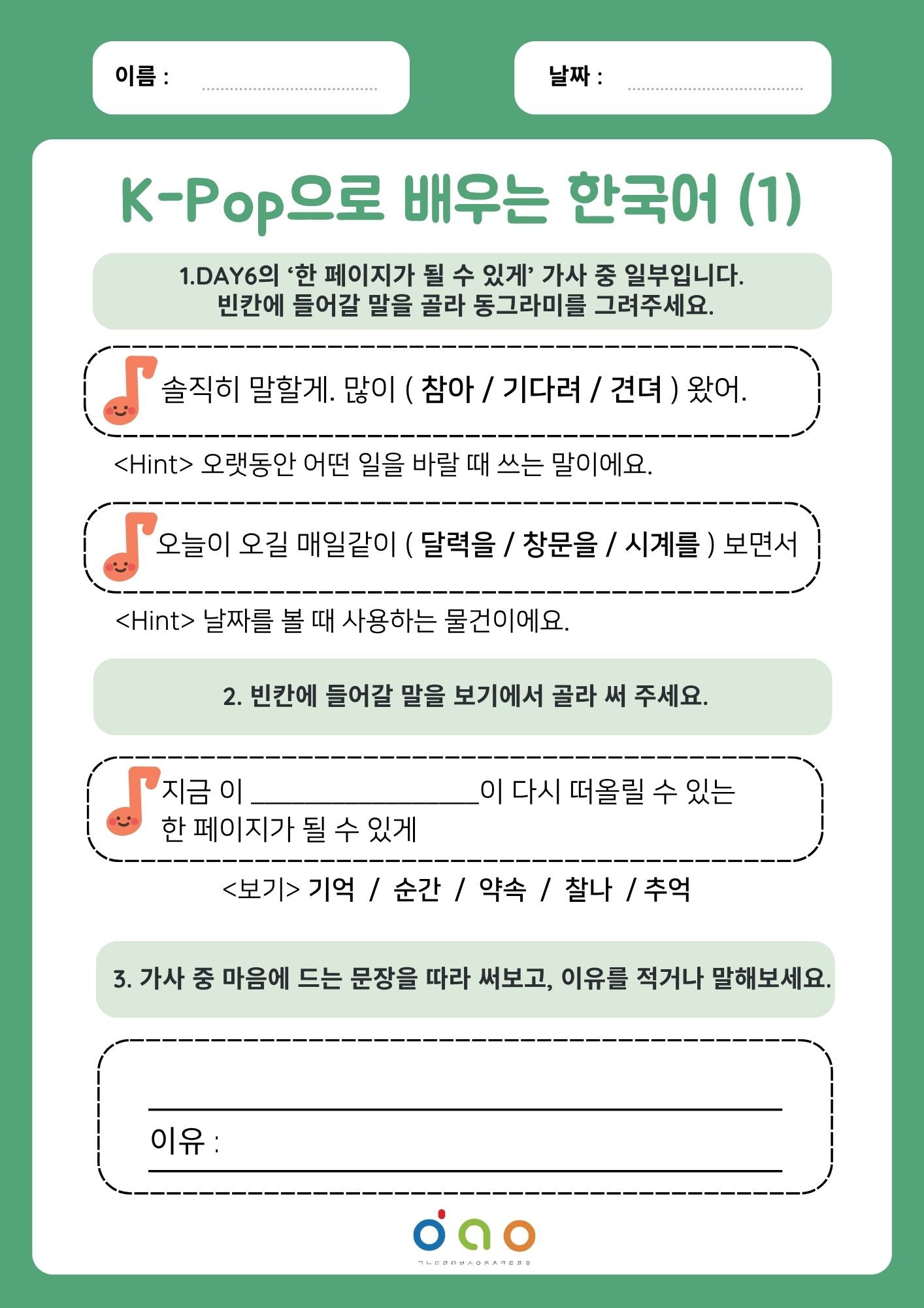 - 활동지(각 1차시) : DAY6의 ‘한 페이지가 될 수 있게’, TWS의 ‘첫만남은 계획대로 되지 않아’, 안예은의 ‘문어의 꿈‘,