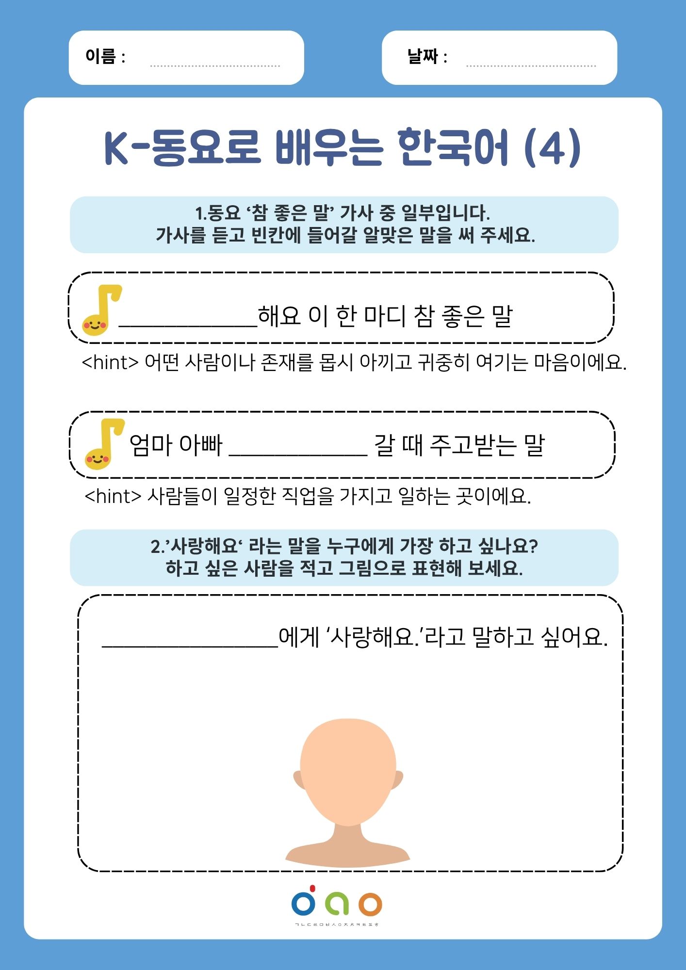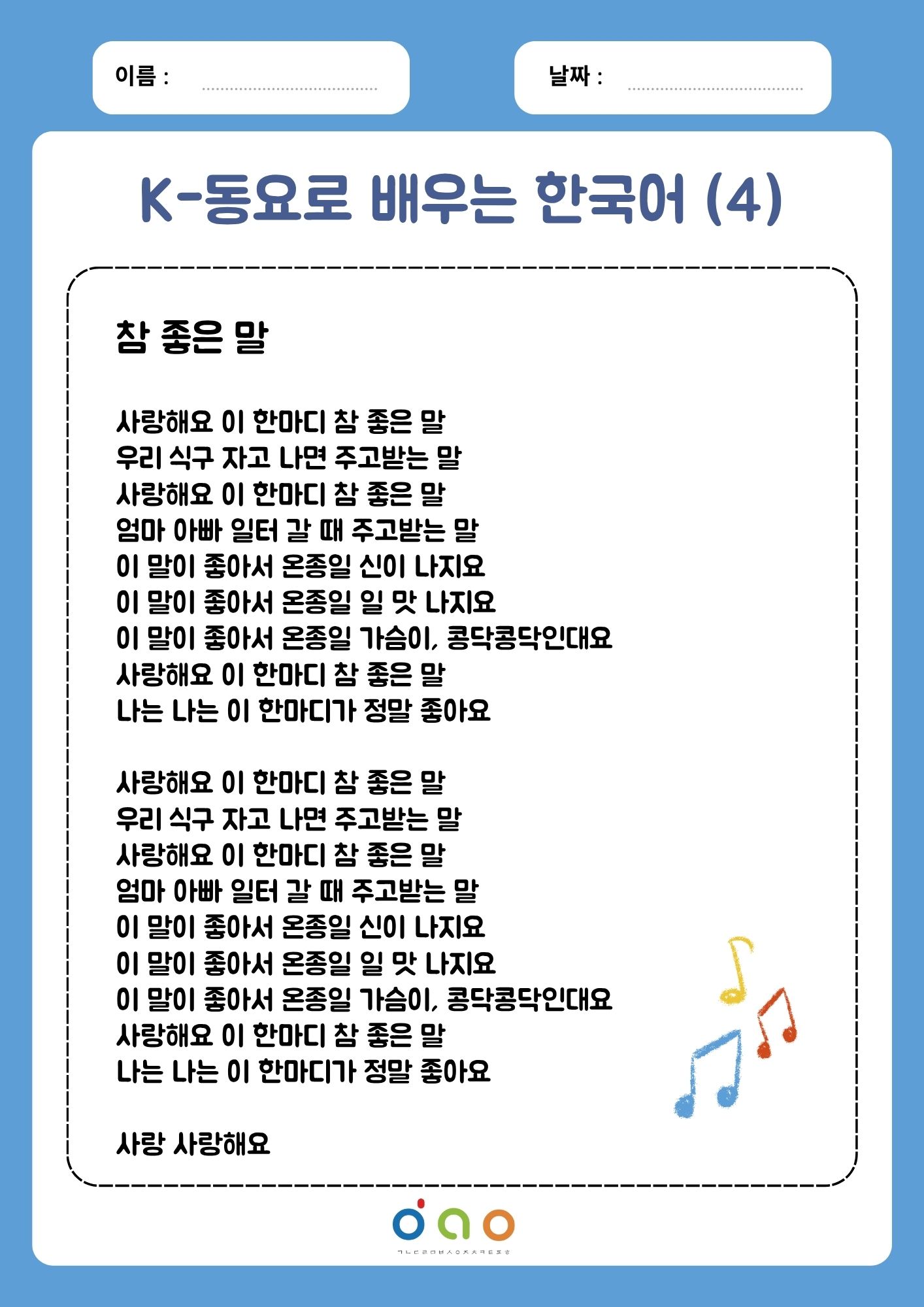 우리나라의 친숙하고 따뜻한 K-동요를 잘 듣고 한국어 공부를 해보는 시간을 가져볼까요?