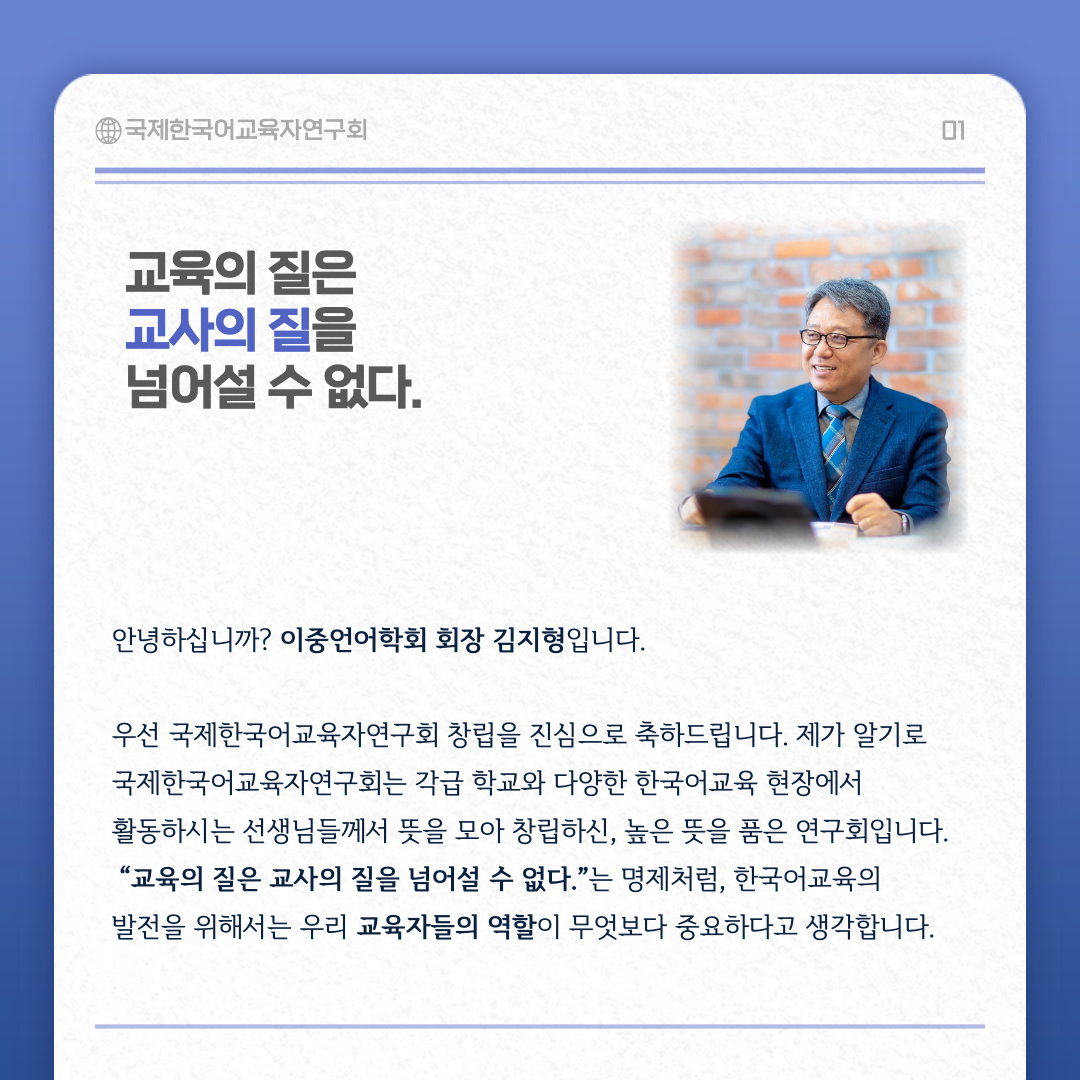 제가 알기로 국제한국어교육자연구회는 각급 학교와 다양한 한국어교육 현장에서 활동하시는 선생님들께서 뜻을 모아 창립하신, 높은 뜻을 품은 연구회입니다. “교육의 질은 교사의 질을 넘어설 수 없다.”는 명제처럼, 한국어교육의 발전을 위해서는 우리 교육자들의 역할이 무엇보다 중요하다고 생각합니다.그런 의미에서 한국어교육의 질 높은 성장을 위해 열정 많은 교육자들이 뜻을 모아 연구회를 창립하게 된 점을 동료 연구자로서 높이 평가합니다.