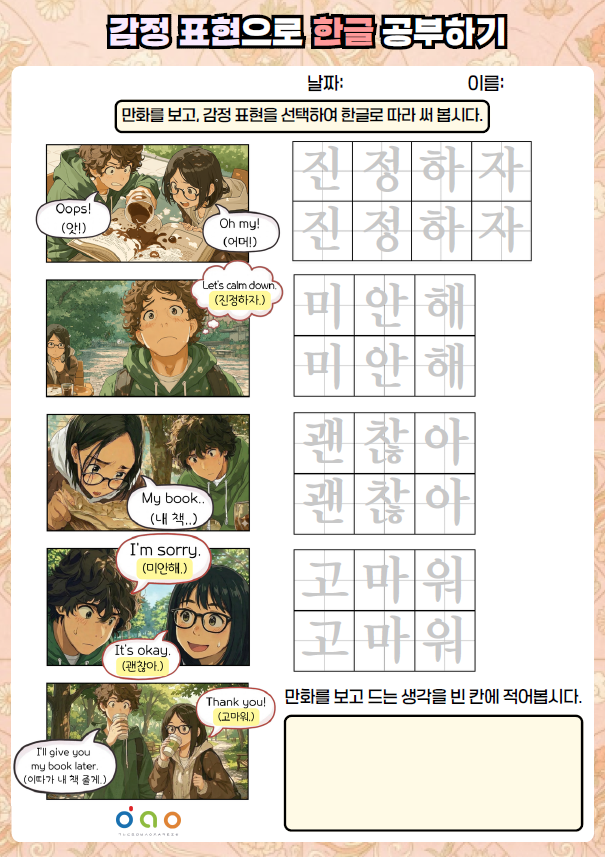 활동지의 만화를 보며, 상황에 맞는 감정 표현으로 한글을 공부해 봅시다!