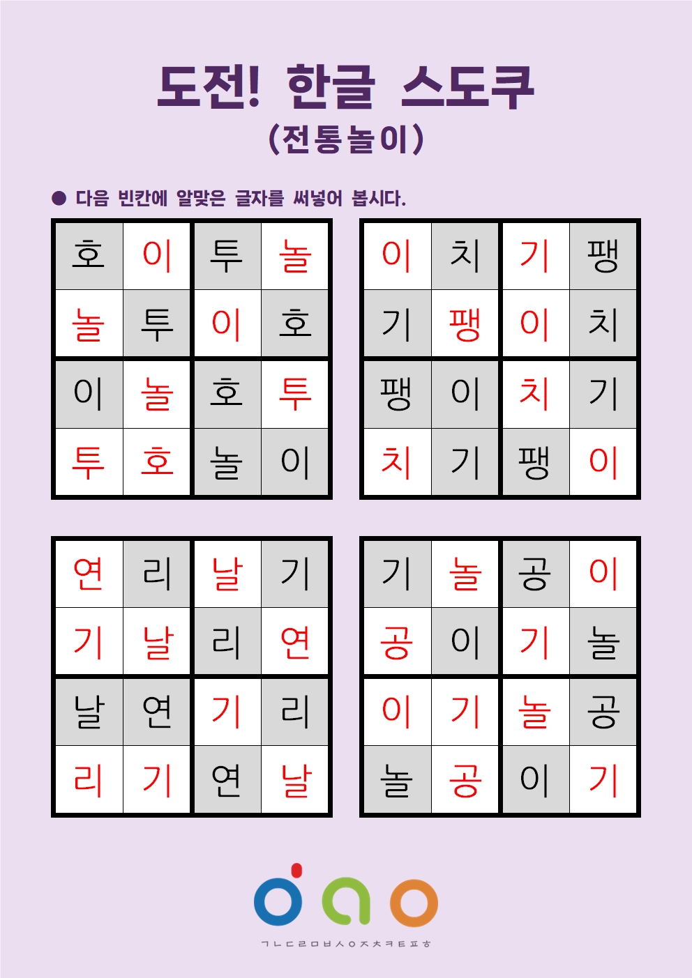 [한글 스도쿠 학습지] 도전! 한글 스도쿠(4X4)[전통놀이 편]