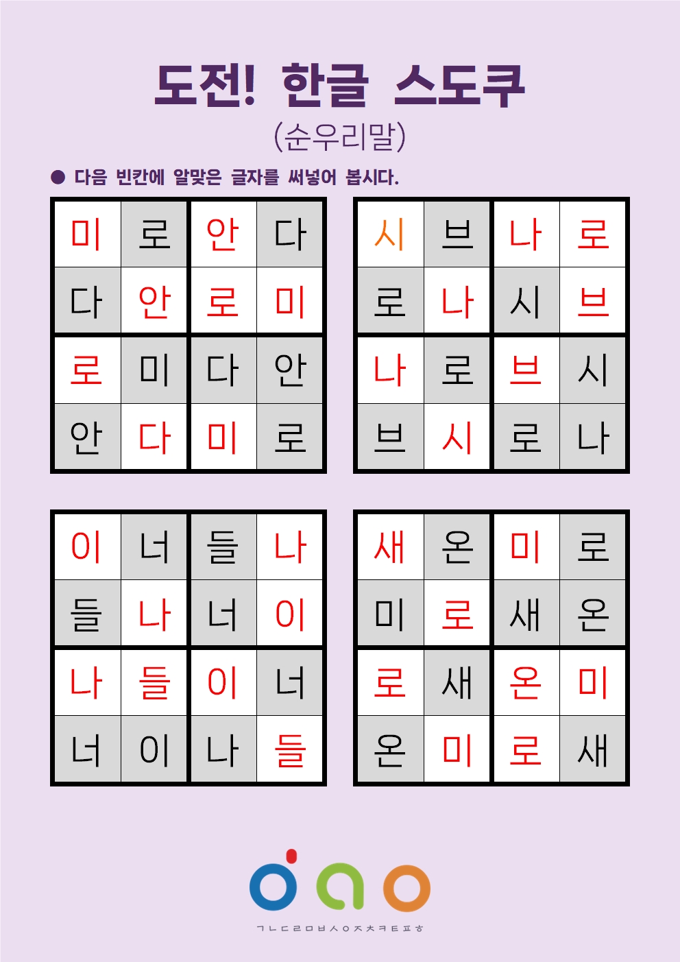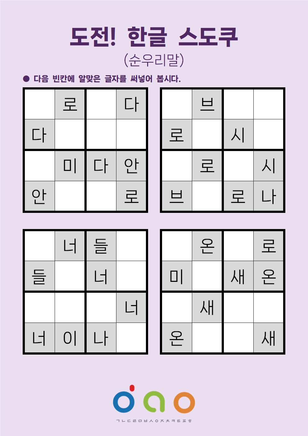 재미있는 한글 스도쿠 놀이로 한글 단어를 익혀 봅시다.